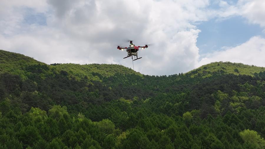 A lighting drone conducts illumination operations at a forest farm in Haicheng City, northeast China's Liaoning Province, May 6, 2025. (Xinhua)