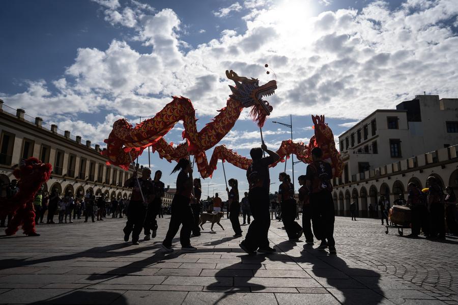 People watch a lion dance performance at the fourth edition of the Chinese New Year culture festival, in Mexico City, Mexico, Jan. 25, 2025. (Xinhua/Li Mengxin)