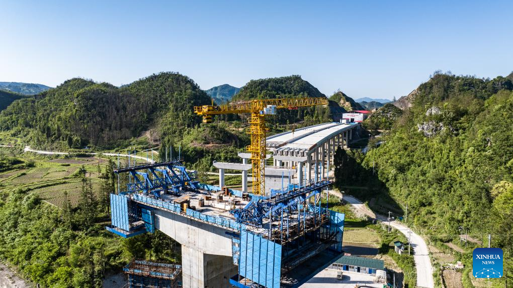 An aerial drone photo taken on May 12, 2025 shows the construction site of a bridge along the Guiyang-Pingtang expressway in southwest China's Guizhou Province. With a designed speed of 100 km per hour, the Guiyang-Pingtang expressway in Guizhou has a total length of 174.018 km. According to the current progress of the project, the construction of the expressway is expected to be completed by the end of this year. (Xinhua/Tao Liang)