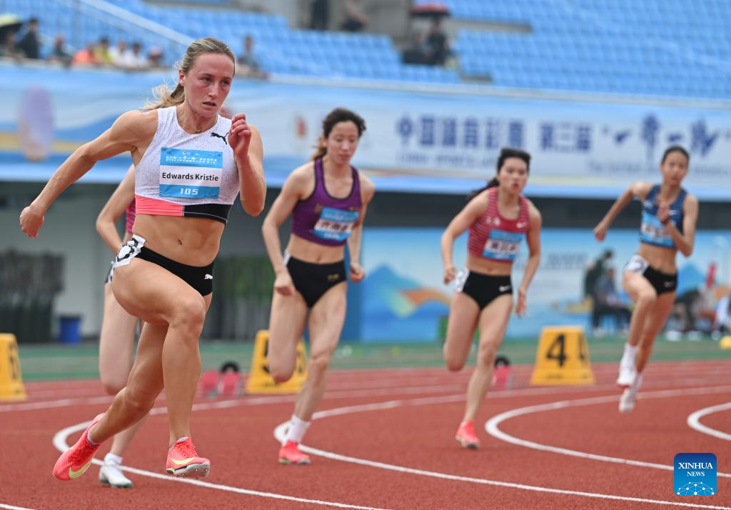 Kristie Edwards (C) of Australia competes during the women's 200m preliminary at the 3rd Belt and Road Athletics Invitational Meeting in southwest China's Chongqing, May 15, 2025. (Xinhua/Chen Cheng)