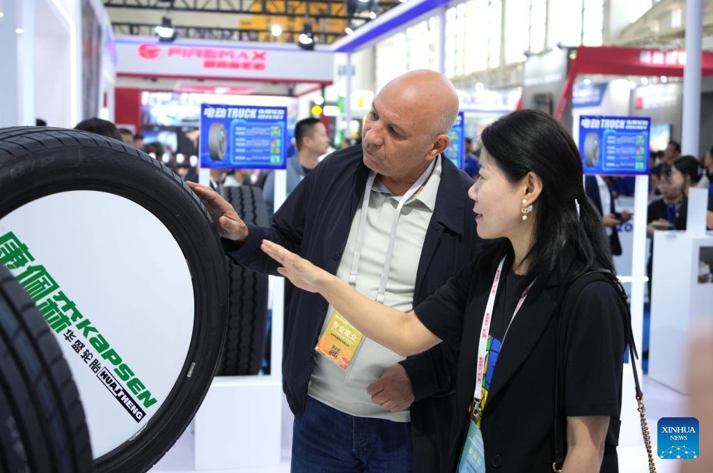People visit the 15th China (Guangrao) International Rubber Tire & Auto Accessory Exhibition in Dongying City, east China's Shandong Province, May 15, 2025. The exhibition kicked off here on Thursday, showcasing cutting-edge technologies and innovative products across the rubber tire industry.