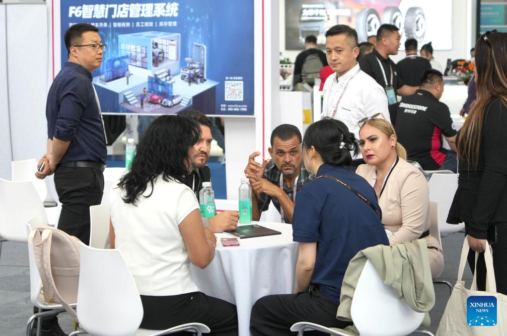 Foreign visitors talk with exhibitors at the 15th China (Guangrao) International Rubber Tire & Auto Accessory Exhibition in Dongying City, east China's Shandong Province, May 15, 2025. The exhibition kicked off here on Thursday, showcasing cutting-edge technologies and innovative products across the rubber tire industry.