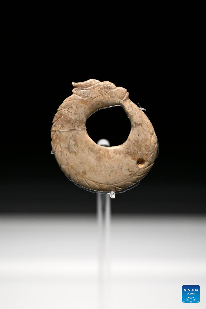 This photo taken on May 16, 2025 shows a jade dragon on display at the Lingjiatan Site Museum in Hanshan County, Ma'anshan City of east China's Anhui Province. (Xinhua/Huang Bohan)