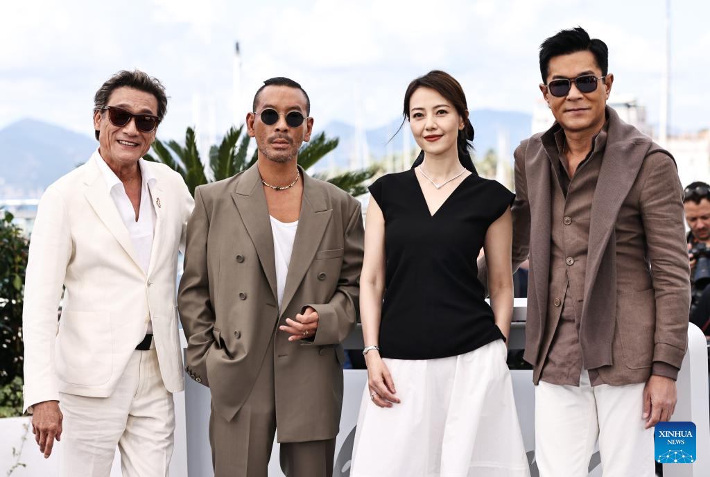 Actor Tony Leung Ka-Fai, director, screenwriter and producer Juno Mak, actress Gao Yuanyuan and actor Louis Koo (L-R), arrive for the photocall of the film "Fung Lam Fo Saan (Sons of the Neon Night)" at the 78th edition of the Cannes Film Festival in Cannes, southern France, on May 17, 2025. (Xinhua/Gao Jing)