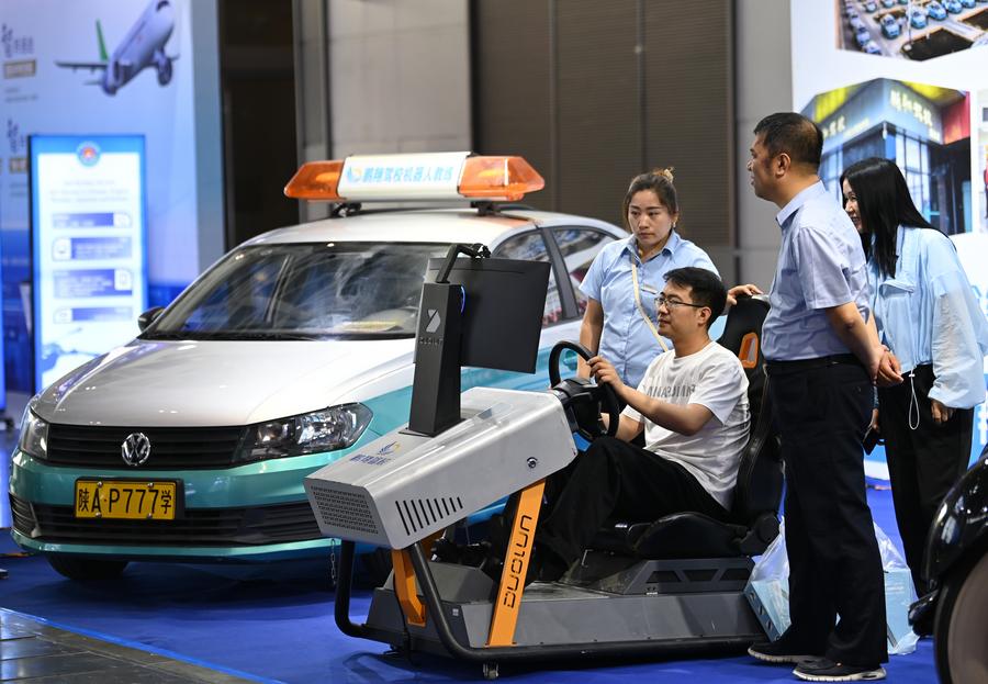 A visitor experiences a driving simulator during the 9th Silk Road International Exposition and the Investment and Trade Forum for Cooperation between East & West China in Xi'an, northwest China's Shaanxi Province, May 21, 2025. (Xinhua/Li Yibo)