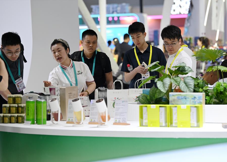 Visitors learn about tea products from Hubei Province during the 9th Silk Road International Exposition and the Investment and Trade Forum for Cooperation between East & West China in Xi'an, northwest China's Shaanxi Province, May 21, 2025. (Xinhua/Li Yibo)