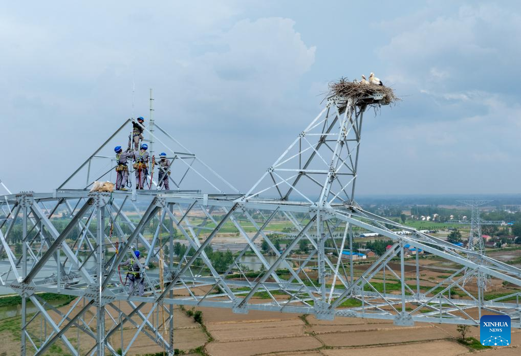 Workers of State Grid Anhui Electric Power Co., Ltd. install a camera near the nest of oriental white storks in Huoqiu County, east China's Anhui Province, May 20, 2025. In early May this year, workers discovered a nest of oriental white stork, a migratory bird under first-class state protection, on the newly-built transmission tower. The State Grid Anhui Electric Power Co., Ltd. has installed high-definition cameras near the nest, assigned designated staff to track and protect the oriental white storks, and postponed the construction progress according to the breeding timeline of the storks. (Xinhua/Zhou Mu)