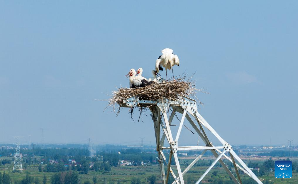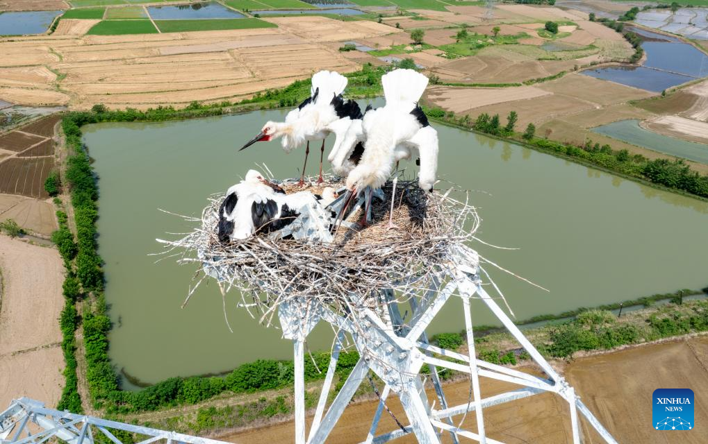 An aerial drone photo taken on May 21, 2025 shows oriental white storks taking care of the nestlings on top of a transmission tower in Huoqiu County, east China's Anhui Province. In early May this year, workers discovered a nest of oriental white stork, a migratory bird under first-class state protection, on the newly-built transmission tower. The State Grid Anhui Electric Power Co., Ltd. has installed high-definition cameras near the nest, assigned designated staff to track and protect the oriental white storks, and postponed the construction progress according to the breeding timeline of the storks. (Xinhua/Zhou Mu)