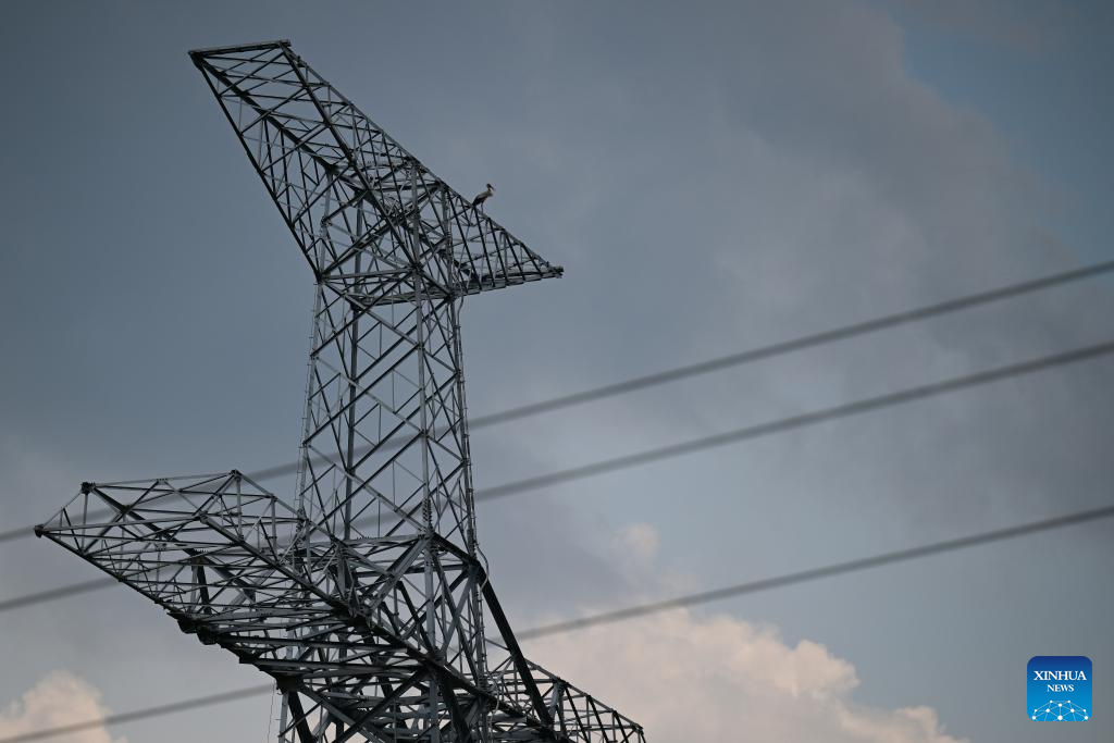 An oriental white stork perches on top of a transmission tower in Huoqiu County, east China's Anhui Province, May 20, 2025. In early May this year, workers discovered a nest of oriental white stork, a migratory bird under first-class state protection, on the newly-built transmission tower. The State Grid Anhui Electric Power Co., Ltd. has installed high-definition cameras near the nest, assigned designated staff to track and protect the oriental white storks, and postponed the construction progress according to the breeding timeline of the storks. (Xinhua/Zhou Mu)