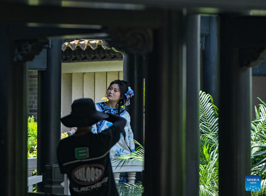 A tourist poses for a photo in the Yongqing Block, Guangzhou, south China's Guangdong Province, May 13, 2025. (Xinhua/Chen Shuo)