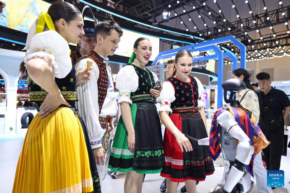 Foreign guests interact with a humanoid robot during the 4th China-CEEC Expo & International Consumer Goods Fair in Ningbo, east China's Zhejiang Province, May 22, 2025. With over 8,000 featured products on display, from traditional goods like wines and cheese to cutting-edge varieties like VR glasses, the 4th China-CEEC Expo & International Consumer Goods Fair unveiled its curtain on Thursday, unleashing vast cooperation potential between China and Central and Eastern European Countries (CEEC). The expo, running from Thursday to Sunday in Ningbo, has attracted 435 enterprises from 14 CEEC countries and nine other countries, including the UK, France, Germany and Italy. (Xinhua/Jiang Han)