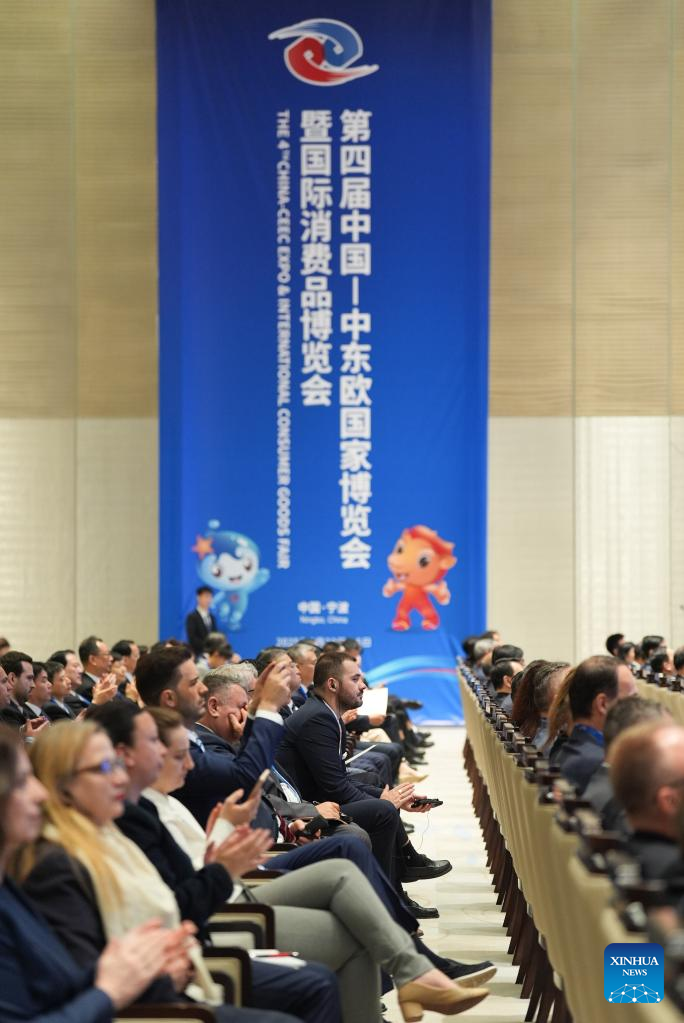 Guests attend the opening ceremony of the 4th China-CEEC Expo & International Consumer Goods Fair in Ningbo, east China's Zhejiang Province, May 22, 2025. With over 8,000 featured products on display, from traditional goods like wines and cheese to cutting-edge varieties like VR glasses, the 4th China-CEEC Expo & International Consumer Goods Fair unveiled its curtain on Thursday, unleashing vast cooperation potential between China and Central and Eastern European Countries (CEEC). The expo, running from Thursday to Sunday in Ningbo, has attracted 435 enterprises from 14 CEEC countries and nine other countries, including the UK, France, Germany and Italy. (Xinhua/Huang Zongzhi)