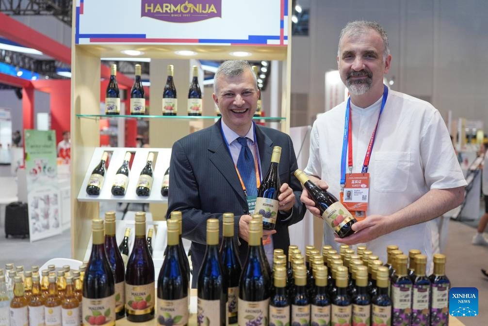 Serbian merchants promote their fruit wine at the 4th China-CEEC Expo & International Consumer Goods Fair in Ningbo, east China's Zhejiang Province, May 22, 2025. With over 8,000 featured products on display, from traditional goods like wines and cheese to cutting-edge varieties like VR glasses, the 4th China-CEEC Expo & International Consumer Goods Fair unveiled its curtain on Thursday, unleashing vast cooperation potential between China and Central and Eastern European Countries (CEEC). The expo, running from Thursday to Sunday in Ningbo, has attracted 435 enterprises from 14 CEEC countries and nine other countries, including the UK, France, Germany and Italy. (Xinhua/Huang Zongzhi)