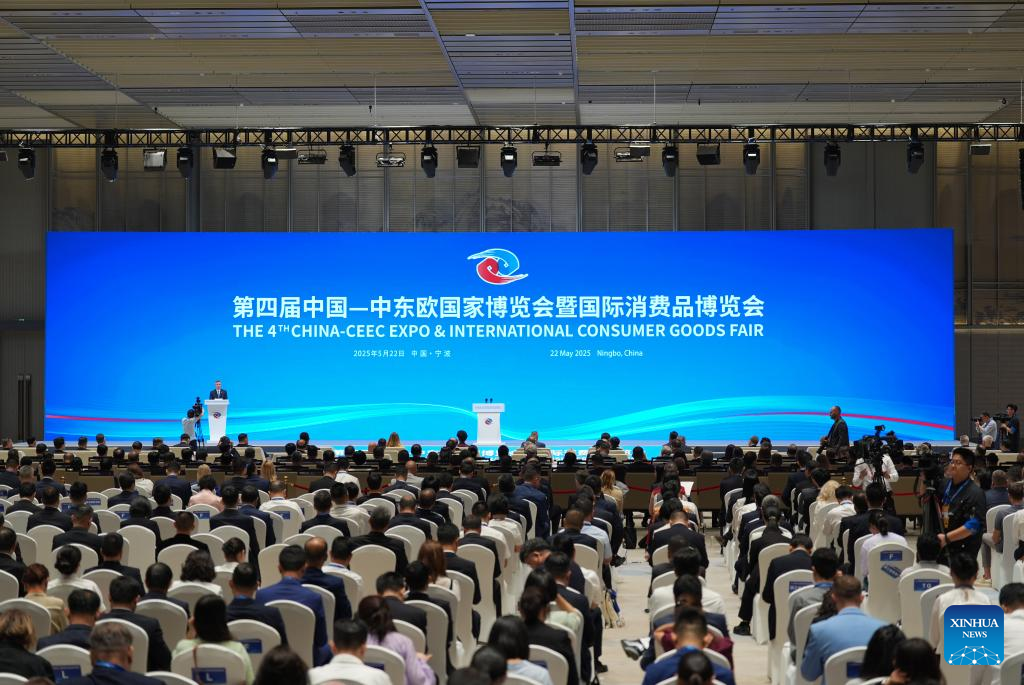 This photo taken on May 22, 2025 shows the opening ceremony of the 4th China-CEEC Expo & International Consumer Goods Fair in Ningbo, east China's Zhejiang Province. With over 8,000 featured products on display, from traditional goods like wines and cheese to cutting-edge varieties like VR glasses, the 4th China-CEEC Expo &International Consumer Goods Fair unveiled its curtain on Thursday, unleashing vast cooperation potential between China and Central and Eastern European Countries (CEEC). The expo, running from Thursday to Sunday in Ningbo, has attracted 435 enterprises from 14 CEEC countries and nine other countries, including the UK, France, Germany and Italy. (Xinhua/Huang Zongzhi)