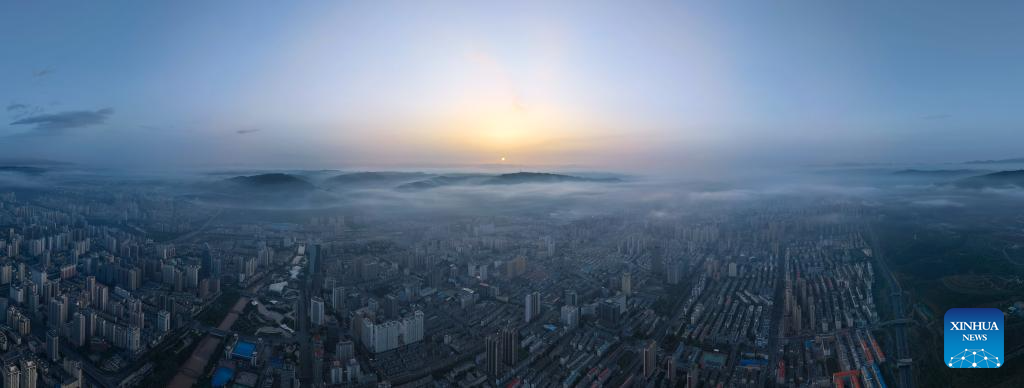 A panoramic aerial drone photo taken on May 22, 2025 shows the sunrise scenery in Xining, northwest China's Qinghai Province. (Xinhua/Qi Zhiyue)