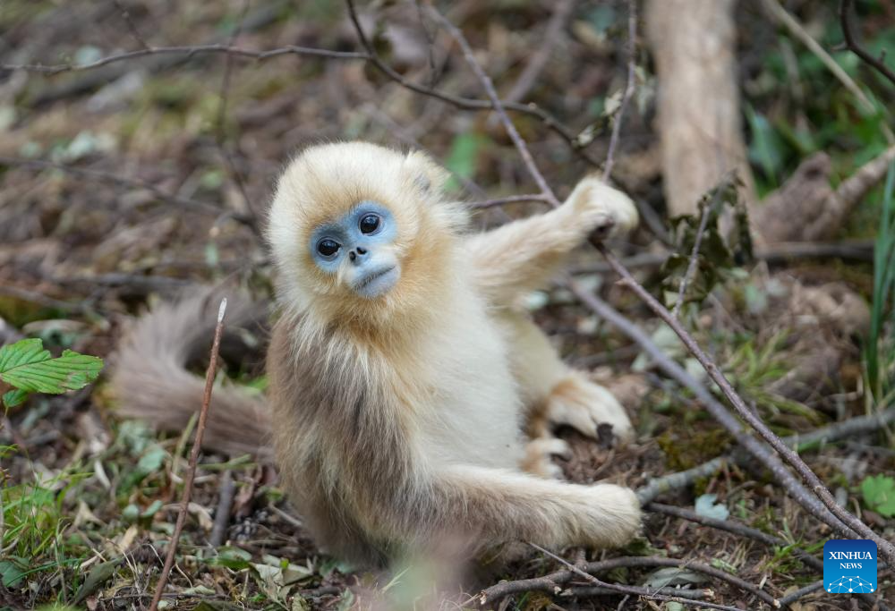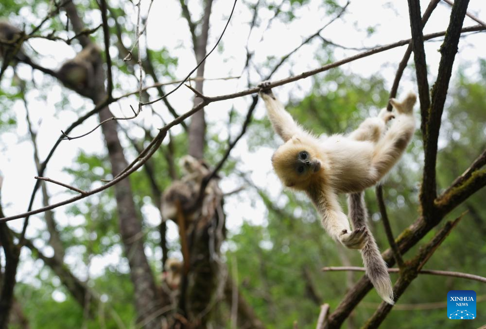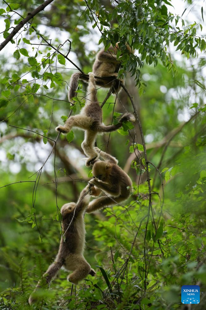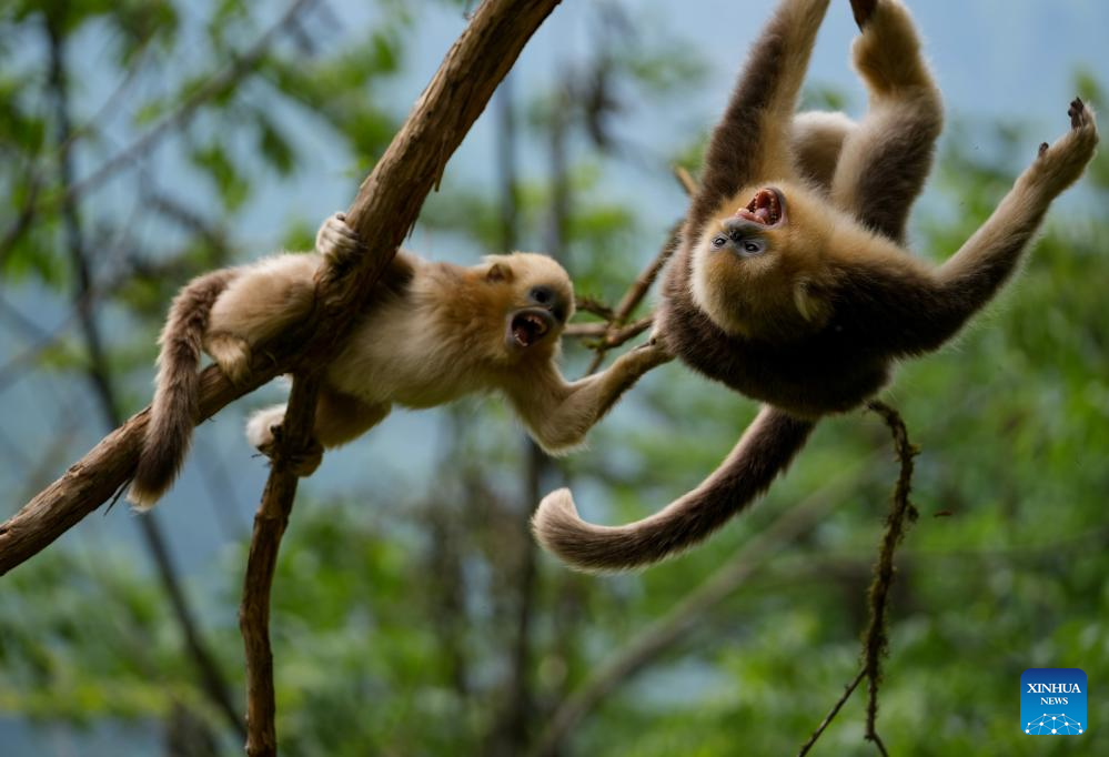 Golden snub-nosed monkeys are pictured in the Pingwu Sichuan golden snub-nosed monkey popular science education base in Pingwu County, Mianyang City of southwest China's Sichuan Province, May 21, 2025. Located within the Xiaohegou Nature Reserve, a provincial-level nature reserve in Sichuan Province, Pingwu Sichuan golden snub-nosed monkey popular science education base is home to over 40 Sichuan golden snub-nosed monkeys. According to the latest monitoring data of 2024, Xiaohegou Nature Reserve is the habitat of about 1,000 Sichuan golden snub-nosed monkeys. (Xinhua/Jiang Hongjing)