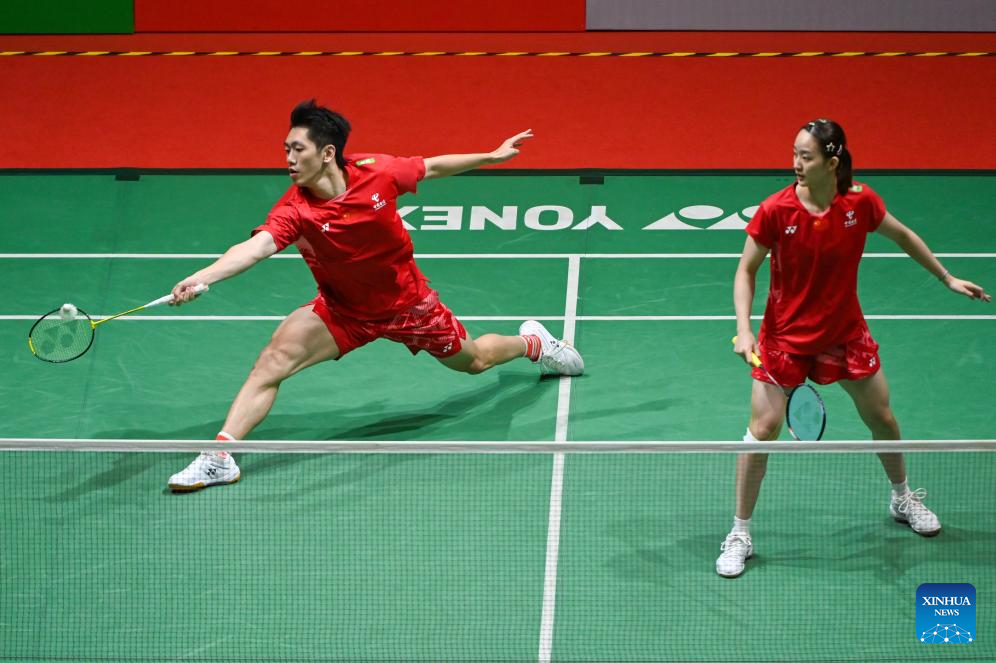 Feng Yanzhe/Huang Dongping (R) of China compete during the mixed doubles quarterfinal against Dechapol Puavaranukroh/Supissara Paewsampran of Thailand at 2025 Malaysia Masters badminton tournament in Kuala Lumpur, Malaysia, May 23, 2025. (Photo by Chong Voon Chung/Xinhua)