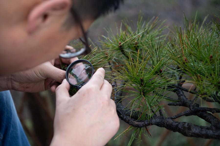 Wu Yijun, a senior engineer of the parks and woods bureau of Huangshan Scenic Area management committee, checks the forestry pests at Lianhua Peak of Huangshan in east China's Anhui Province, on April 22, 2025. (Xinhua/Zhang Duan)