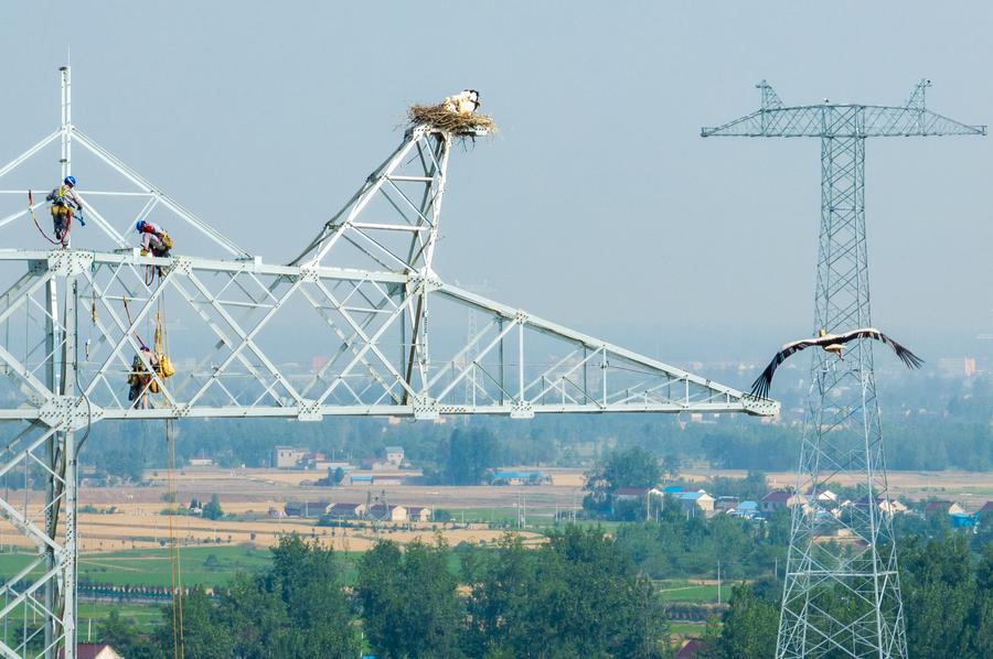 An aerial drone photo taken on May 20, 2025 shows workers of State Grid Anhui Electric Power Co., Ltd. installing a camera near the nest of oriental white storks, a migratory bird under first-class state protection, to track and protect them, in Huoqiu County, east China's Anhui Province. In early May this year, workers discovered the nest on the newly-built transmission tower. (Photo by Zhao Xianfu/Xinhua)