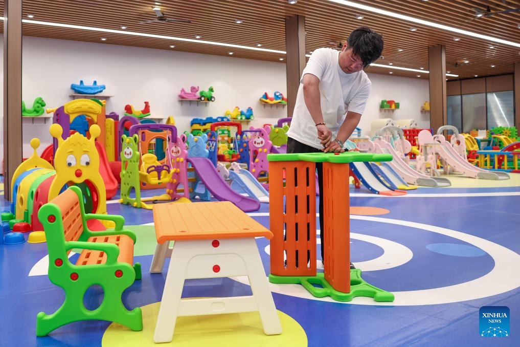 A set of non-powered amusement facilities is pictured at the exhibition hall of a toy company in Yongjia County, east China's Zhejiang Province, May 8, 2025. (Xinhua/Jiang Han)