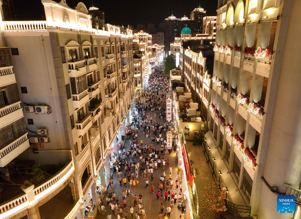 People walk on a street in Wuzhou, south China's Guangxi Zhuang Autonomous Region, May 1, 2025. In recent years, Guangxi has been continuously focusing on the upgrade of consumption experience and promoting the integration of cultural tourism and commerce. Various night fairs and booths have boosted consumption and injected vitality into the night economy. (Xinhua/Huang Xiaobang)