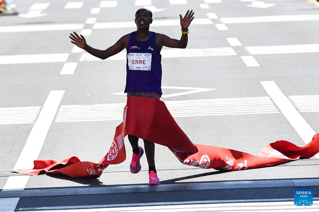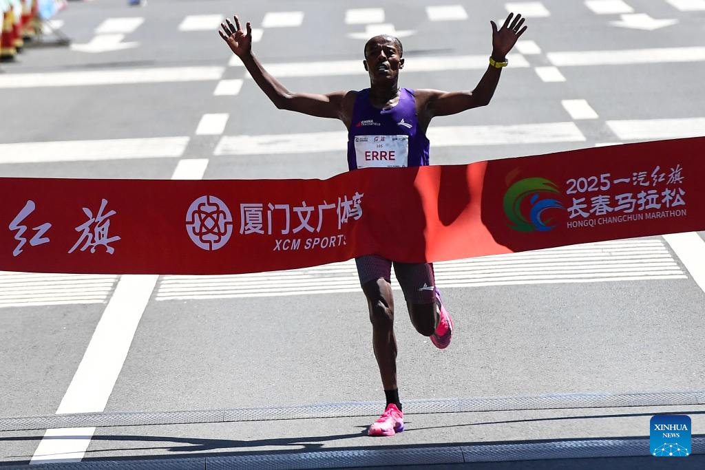 Seboka Negusse Erre of Ethiopia crosses the finish line to win the men's marathon event during the 2025 Hongqi Changchun Marathon in Changchun, northeast China's Jilin Province, on May 25, 2025. (Xinhua/Zhang Nan)