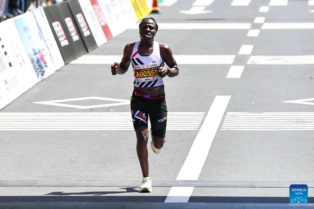 Wamalwa Lydla Naliaka of Kenya runs to the finish line to win the second place of women's marathon event during the 2025 Hongqi Changchun Marathon in Changchun, northeast China's Jilin Province, on May 25, 2025. (Xinhua/Zhang Nan)