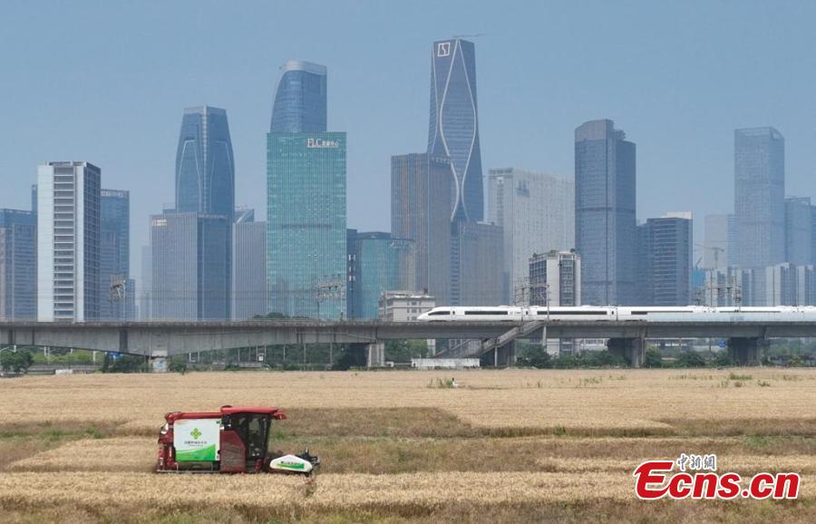 Harvesters work in a wheat field near Hangzhou's CBD, east China's Zhejiang Province, May 26, 2025. (China News Service/Wang Gang)