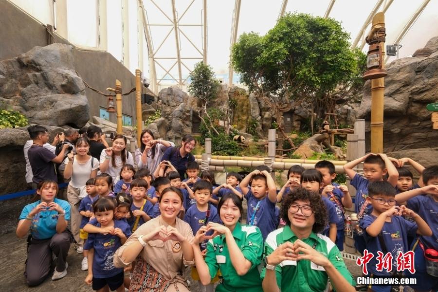 People pose for a group photo at the Giant Panda Adventure area of the Ocean Park in the Hong Kong Special Administrative Region, May 27, 2025. (China News Service/Chen Yongnuo)