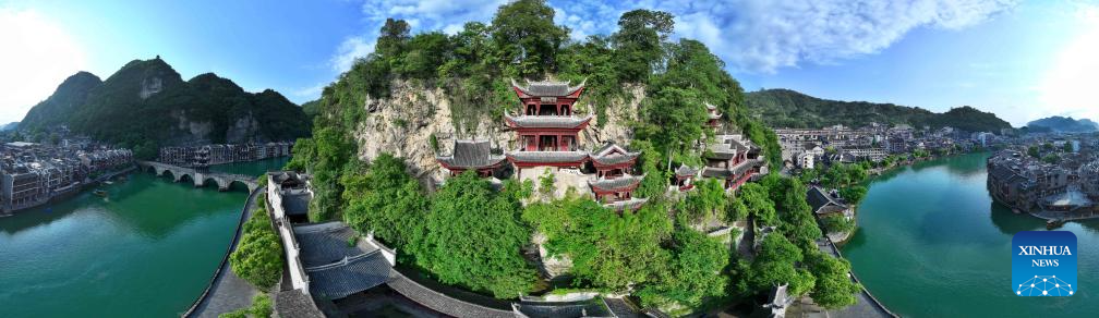 An aerial drone photo taken on May 20, 2025 shows a panoramic view of Qinglong Cave Complex built on the cliff in Zhenyuan ancient town in Qiandongnan Miao and Dong Autonomous Prefecture in southwest China's Guizhou Province. The architectural complex, located on a 300-meter-long and 80-meter-high cliff, is a model of the integration of architectural characters between the north and the south of China. (Xinhua/Ou Dongqu)