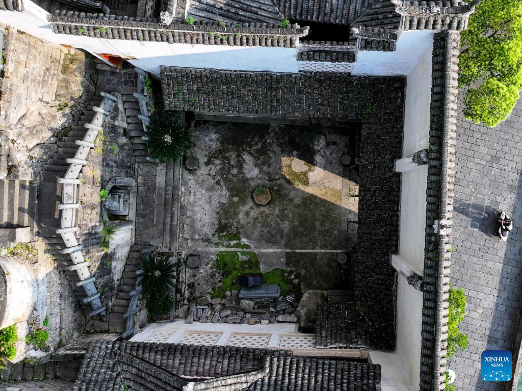 An aerial drone photo taken on May 20, 2025 shows a view of Qinglong Cave Complex built on the cliff in Zhenyuan ancient town in Qiandongnan Miao and Dong Autonomous Prefecture in southwest China's Guizhou Province. The architectural complex, located on a 300-meter-long and 80-meter-high cliff, is a model of the integration of architectural characters between the north and the south of China. (Xinhua/Ou Dongqu)