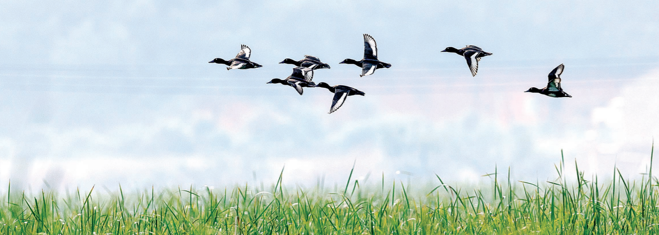 Baer's pochards fly over a wetland in Wuhan, central China's Hubei Province. (Photo/Changjiang Daily)