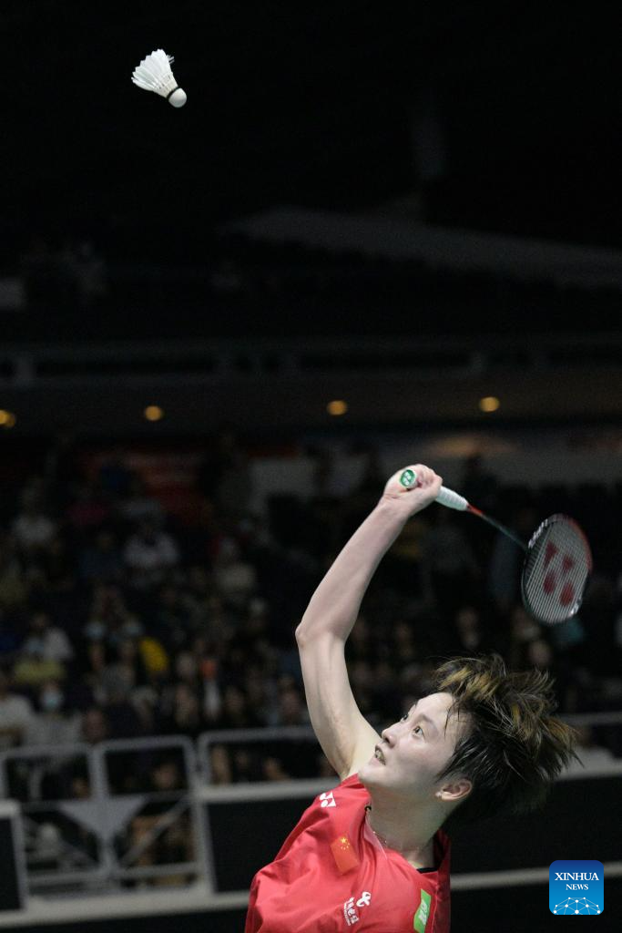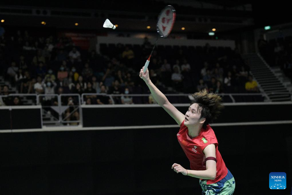 Chen Yufei of China hits a return during the women's singles quarterfinal against An Se-young of South Korea at the Singapore Badminton Open 2025 in Singapore, May 30, 2025. (Photo by Then Chih Wey/Xinhua)