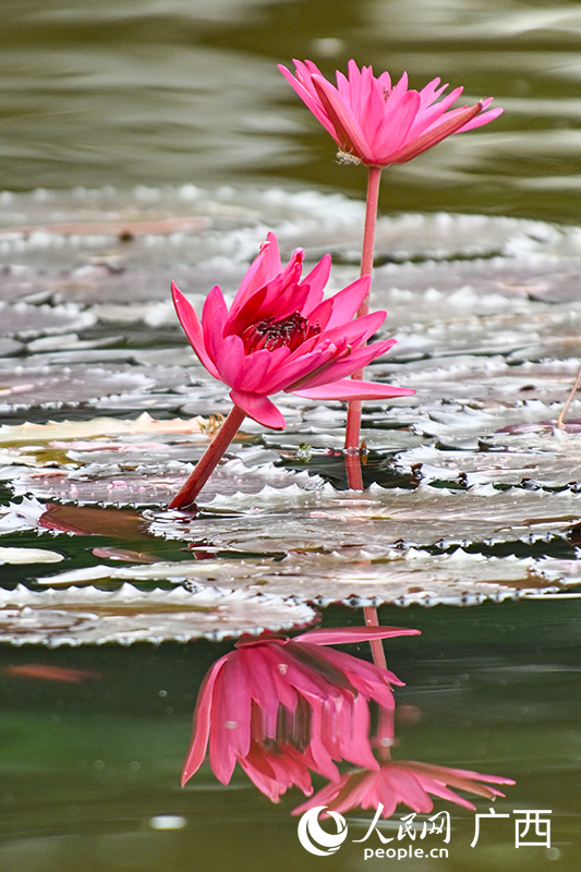 Photo shows a rare lotus flower with two pistils (left) at Guangxi University in south China's Guangxi Zhuang Autonomous Region. (People's Daily Online/Lei Qijun)