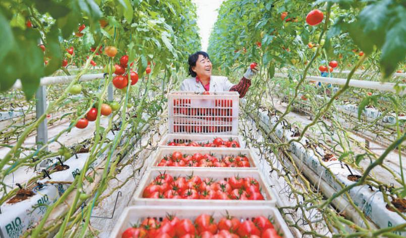 A woman picks tomatoes in a high-tech farming base in Urumqi, northwest China's Xinjiang Uygur Autonomous Region. (Photo by Jiang Yushi/People's Daily)