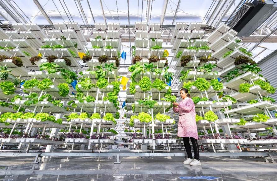 In a smart agriculture pavilion at the Xinjiang Agricultural Expo Park in northwest China's Xinjiang Uygur Autonomous Region, rows of leafy greens flourish on a mobile, multi-layered vertical growing system. It's a vivid display of how advanced agricultural technology is reshaping farming practices in the region.