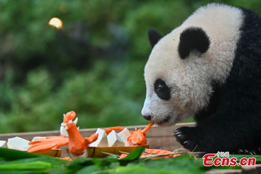 Giant panda Meng Meng enjoys a special meal for the Dragon Boat Festival at the Chimelong Safari Park in Guangzhou, south China's Guangdong Province, May 29, 2025. (China News Service/Chen Jimin)