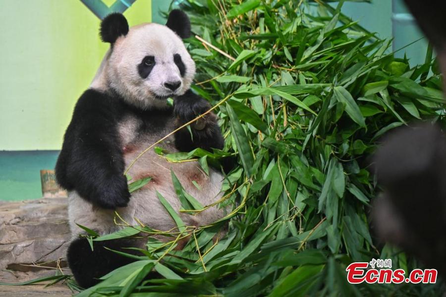 Giant panda "Mei Zhu" enjoys a special meal for the Dragon Boat Festival at the Chimelong Safari Park in Guangzhou, south China's Guangdong Province, May 29, 2025. (China News Service/Chen Jimin)