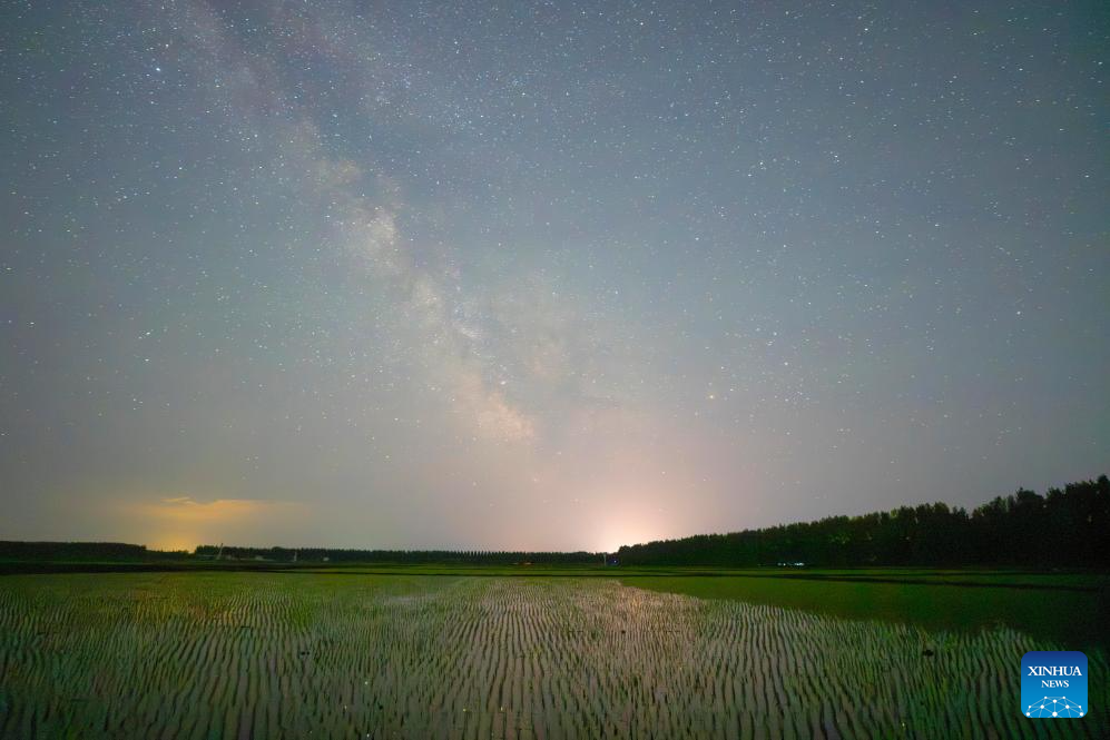 This photo shows a paddy rice field under the starry sky in Youyi County of Shuangyashan City, northeast China's Heilongjiang Province, May 28, 2025. With paddy rice transplanting largely concluded in Heilongjiang, the vast black soil in the province is now dressed in green, hinting the hope for a bountiful harvest. The Milky Way spreading across a starry sky is mirrored in waterlogged paddy rice fields, making a breathtaking scene in the early summer night. (Photo by Han Yang/Xinhua)