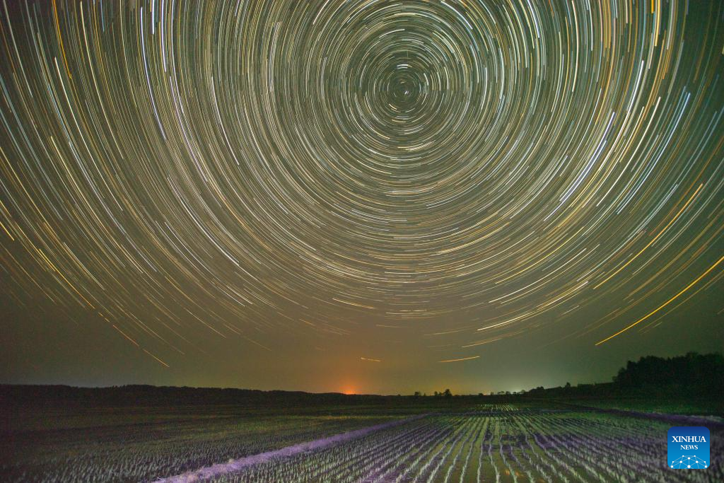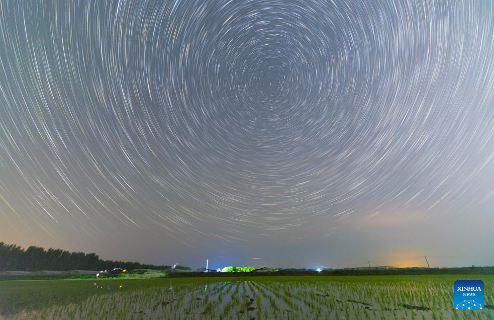 This stack composite photo shows a paddy rice field under the starry sky in Youyi County of Shuangyashan City, northeast China's Heilongjiang Province, May 27, 2025. With paddy rice transplanting largely concluded in Heilongjiang, the vast black soil in the province is now dressed in green, hinting the hope for a bountiful harvest. The Milky Way spreading across a starry sky is mirrored in waterlogged paddy rice fields, making a breathtaking scene in the early summer night. (Photo by Han Yang/Xinhua)