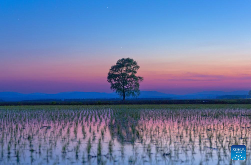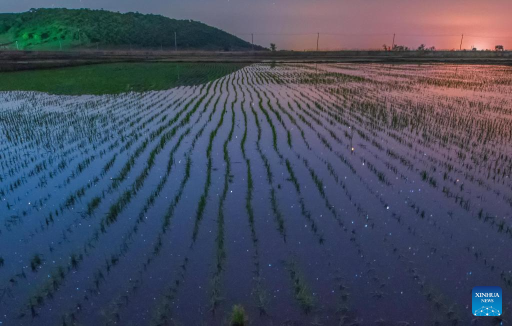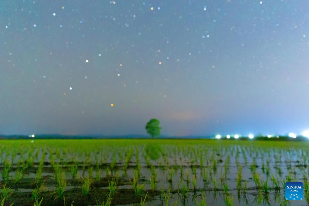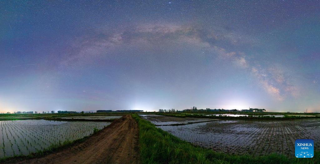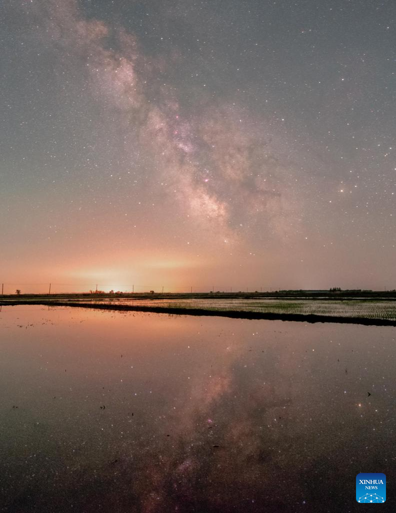 This photo shows a paddy rice field under the starry sky in Ning'an, Mudanjiang City, northeast China's Heilongjiang Province, May 24, 2025. With paddy rice transplanting largely concluded in Heilongjiang, the vast black soil in the province is now dressed in green, hinting the hope for a bountiful harvest. The Milky Way spreading across a starry sky is mirrored in waterlogged paddy rice fields, making a breathtaking scene in the early summer night. (Photo by Wang Baoxun/Xinhua)