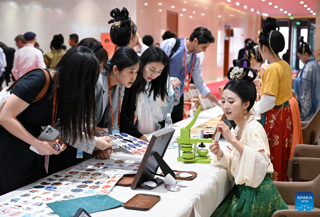 A guest experiences Dunhuang culture after the opening ceremony of the fourth Dialogue on Exchanges and Mutual Learning among Civilizations in Dunhuang, northwest China's Gansu Province, May 30, 2025. The fourth Dialogue on Exchanges and Mutual Learning among Civilizations kicked off here on Friday. About 400 people attended the meeting, including political leaders, scholars, and heads of international organizations and non-governmental organizations from multiple countries. (Xinhua/Zhang Rui)