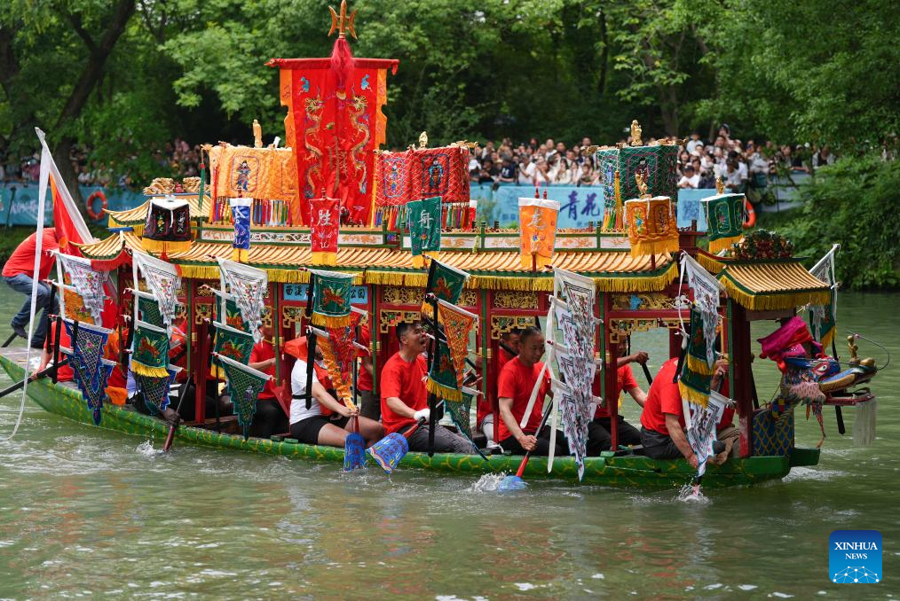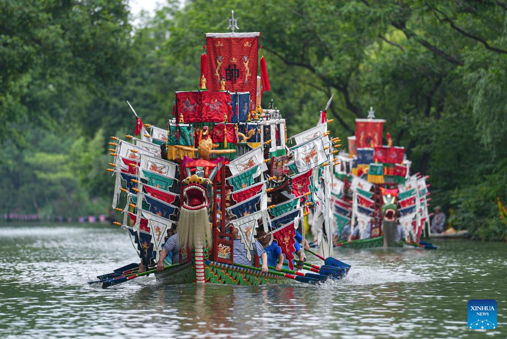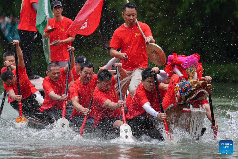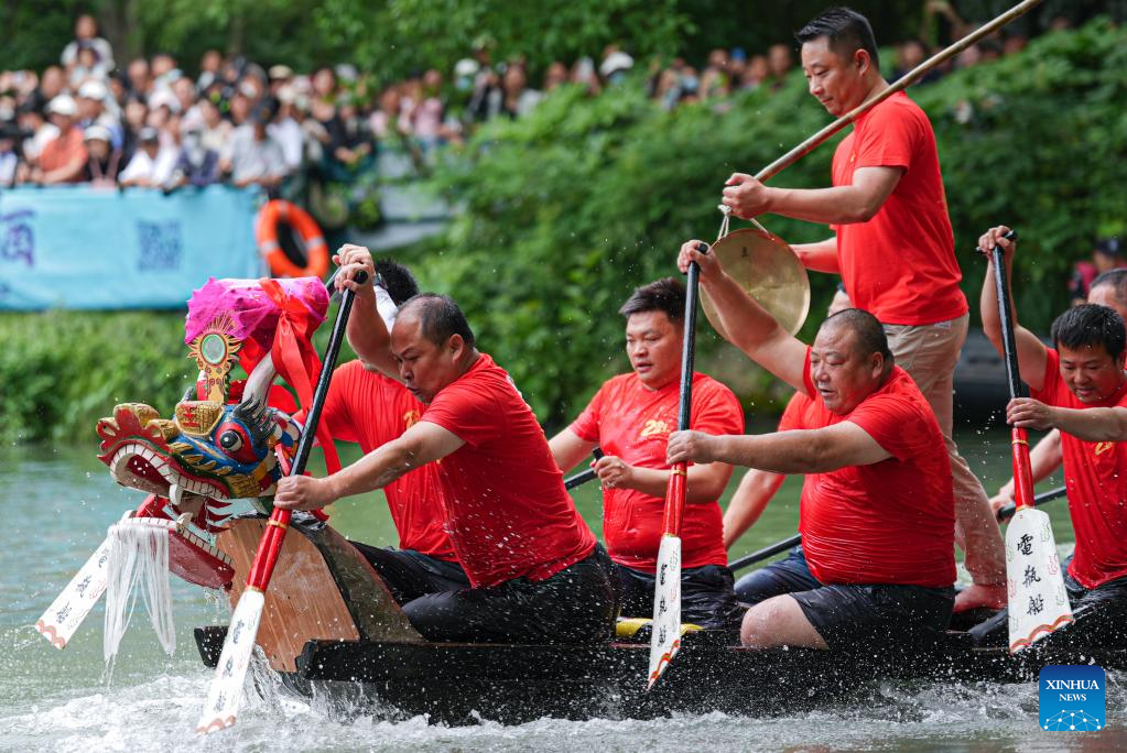 Villagers take part in a traditional dragon boat race in Xixi National Wetland Park in Hangzhou, east China's Zhejiang Province, May 31, 2025. The dragon boat race originated from Jiangcun Village was listed in China's national intangible cultural heritage list in 2011. (Xinhua/Huang Zongzhi)