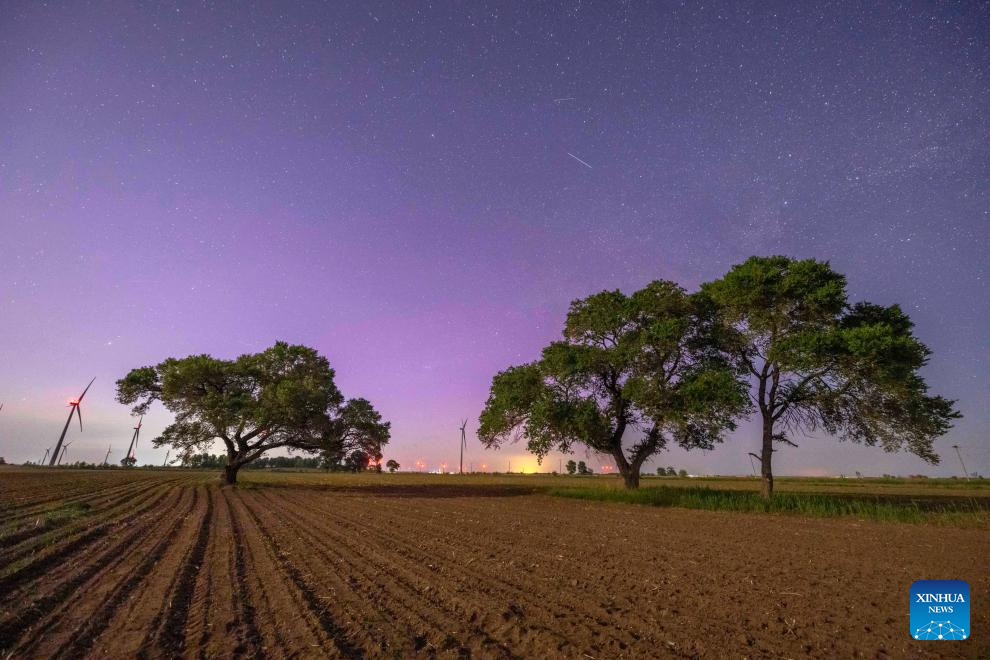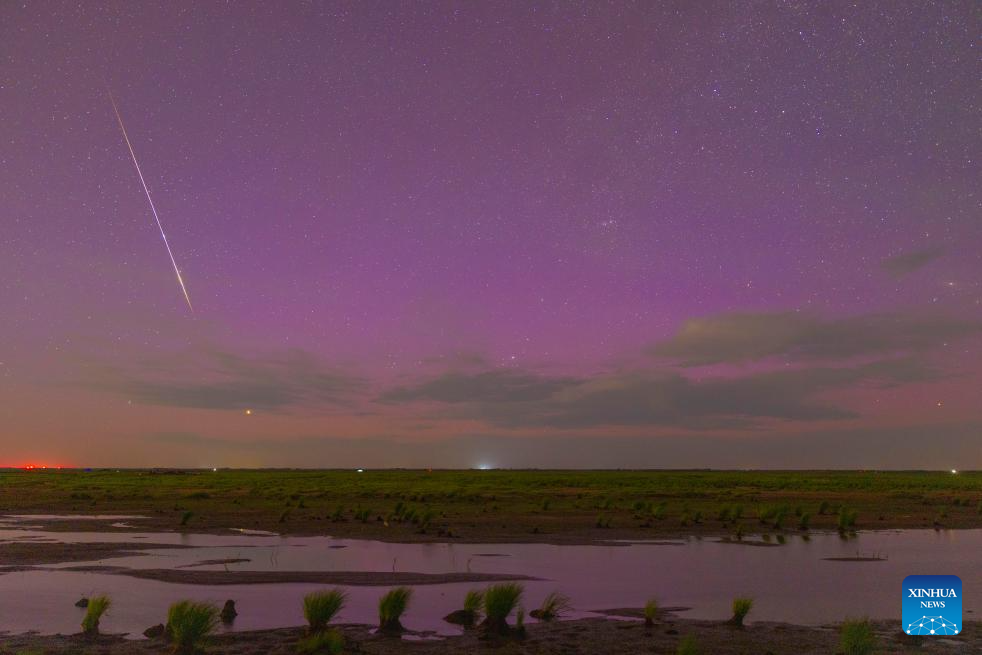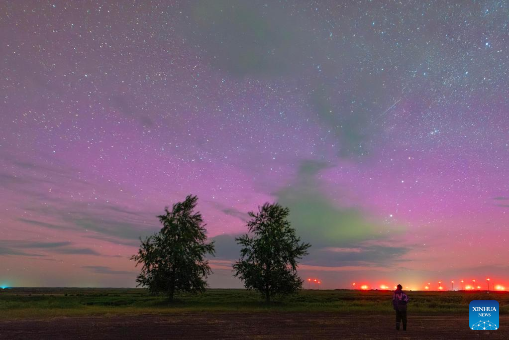This photo taken on June 1, 2025 shows a view of aurora and a dashing meteor in Jixian County of Shuangyashan City, northeast China's Heilongjiang Province. (Photo by Han Yang/Xinhua)