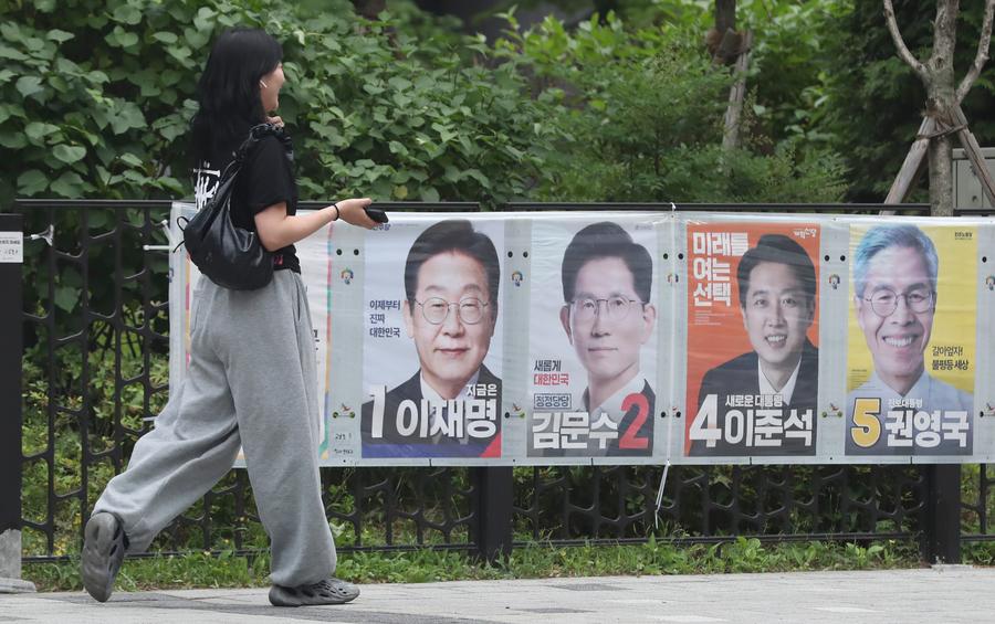A pedestrian walks past a campaign poster of presidential candidates in Seoul, South Korea, June 2, 2025. (Xinhua/Yao Qilin)