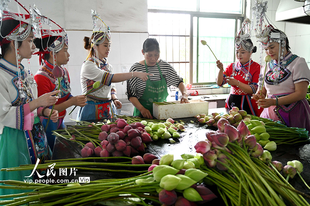 Staff from the Shili Lotus Common Prosperity Workshop in Wuyi county, Jinhua, east China's Zhejiang Province, harvested fresh-cut lotus flowers in the paddies and prepared them for delivery on June 2.