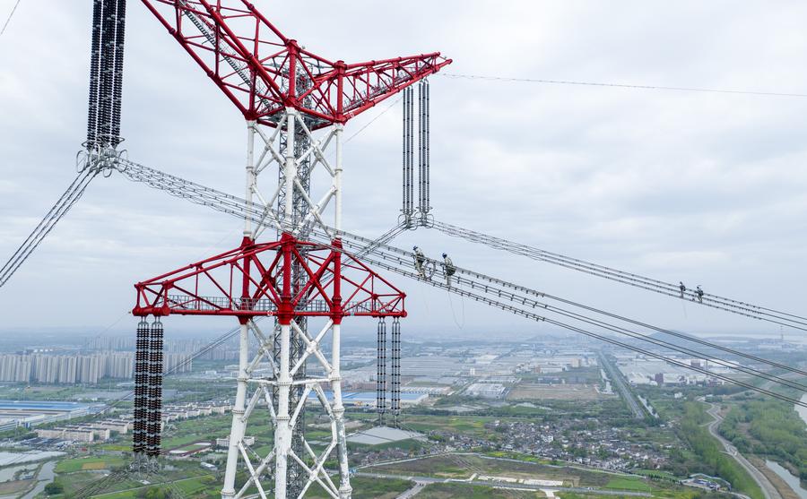 An aerial drone photo taken on April 10, 2024 shows electrical workers inspecting a power transmission line in Jiujiang District of Wuhu City, east China's Anhui Province. (Photo by Zhao Xianfu/Xinhua)