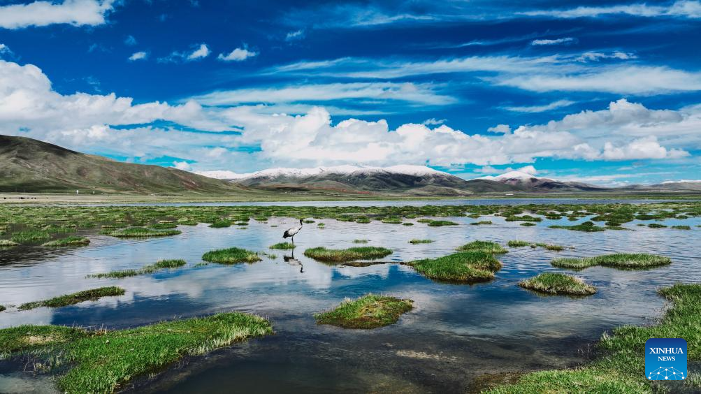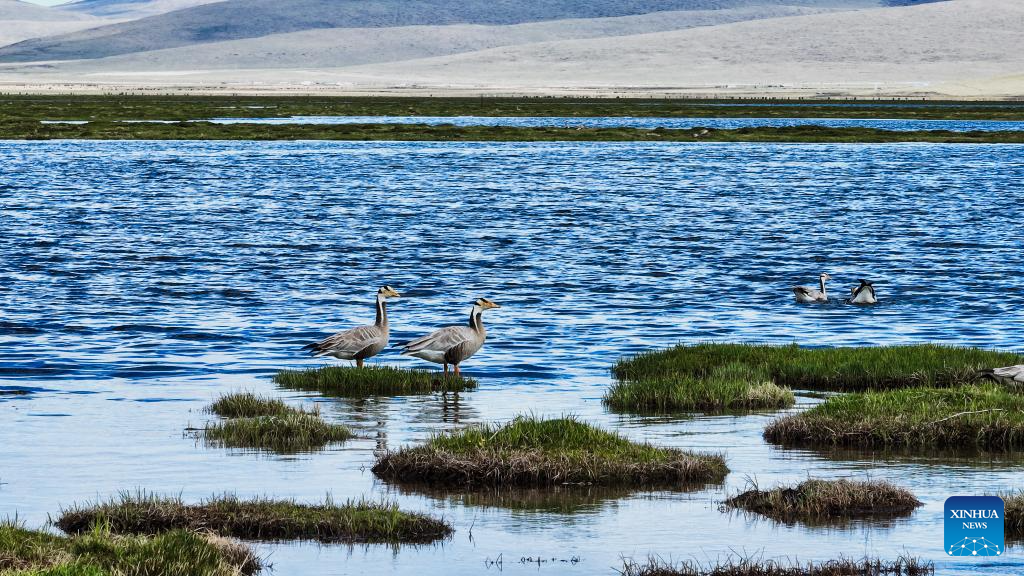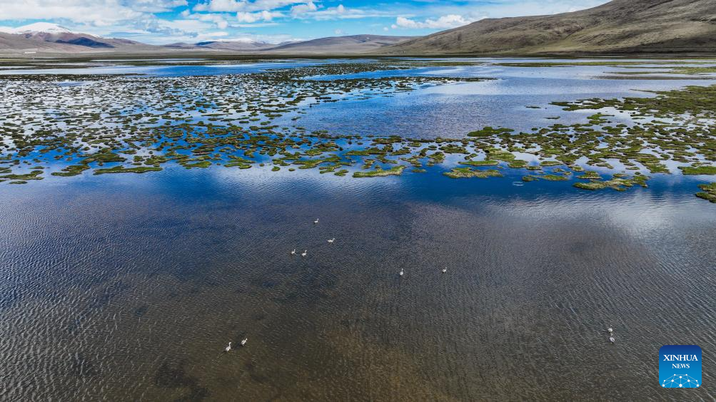 According to monitoring data of May this year, 37 species of birds including bar-headed geese and black necked cranes inhabited here. (Photo by Du Xiaowei/Xinhua)
