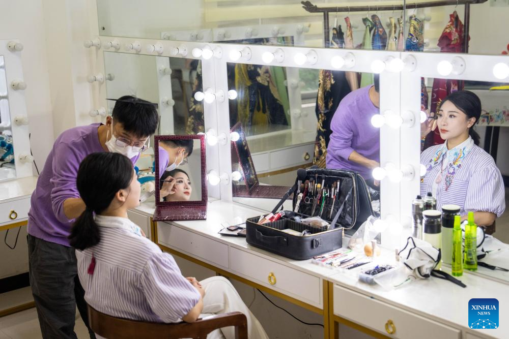 Actress Liu Jie (R) gets prepared before a performance at the dressing room of the Hunan Kunqu Opera Troupe in Beihu District of Chenzhou City in central China's Hunan Province, June 3, 2025.