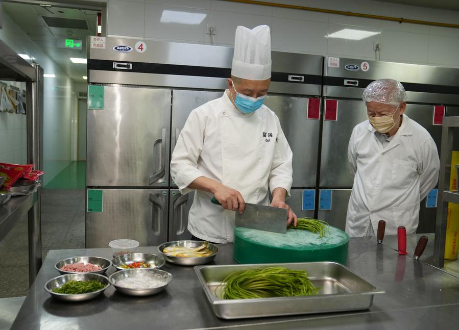 Kong Hainan (R) watches as a chef cooks a dish with ottelia acuminata at the dining hall of Shanghai Jiao Tong University in east China's Shanghai, May 29, 2025. (Xinhua/Liu Ying)